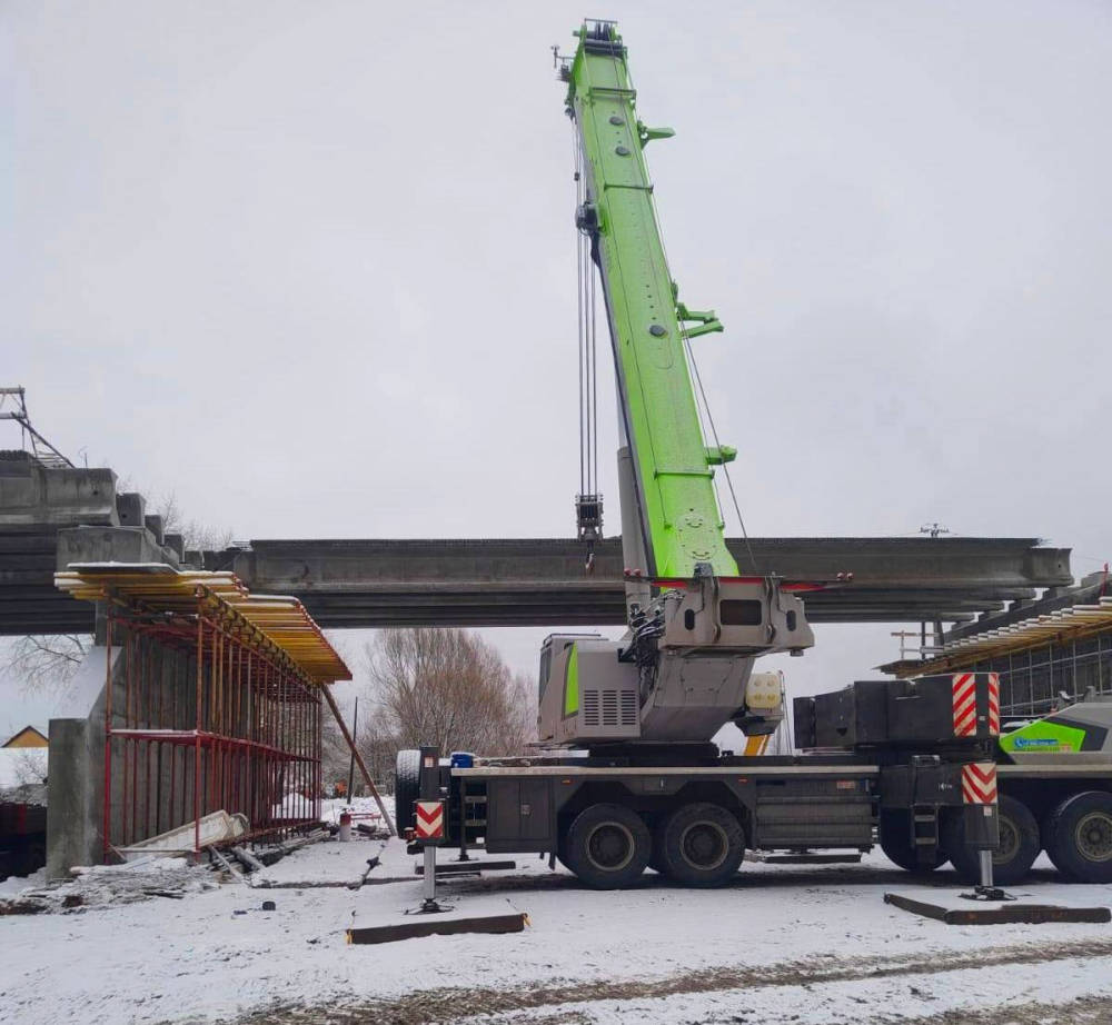 В настоящее время специалисты подрядной организации — ООО «Дорстрой 32» выполняют сложнейший этап ремонта — монтируют железобетонные балки пролётных строений. Уже смонтированы пролёты длиной 11,9, 15 и 24 метра. Для этих целей на стройплощадке применяется кран с высокой грузоподъёмностью, позволяющий поднимать и перемещать многотонные конструкции.