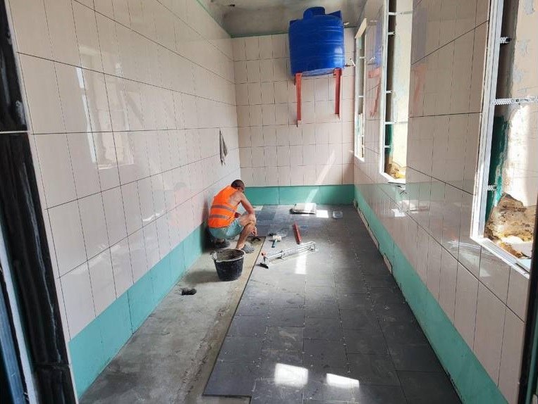 По информации администрации Брянки, в школе №19 специалисты залили армированный пол и закончили монтаж каркаса и крепление влагостойкого гипсокартона. Параллельно ведется укладка керамической плитки и ремонт санузлов.