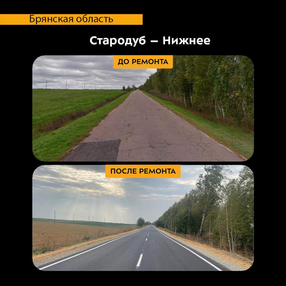 В 2024 году в Брянской области по нацпроекту «Безопасные качественные дороги» капитально отремонтировали участок автодороги Стародуб – Нижнее. Протяженность обновленной дороги составила 4,6 км.