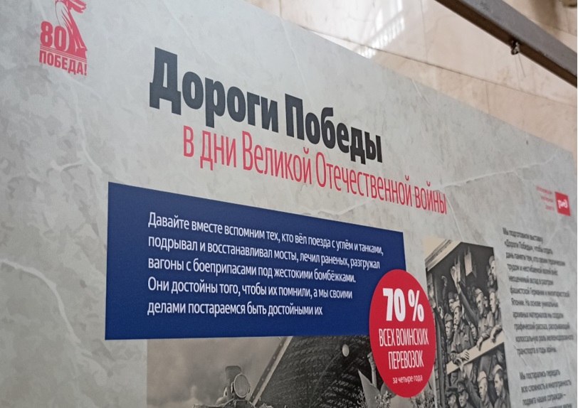 Пассажиры, ожидающие свой поезд или пересадку, а также посетители вокзала имеют возможность увидеть увлекательные архивные фотографии, карты, инфографику, представленные на ней, повествующие о роли стальных магистралей в годы Великой Отечественной войны.