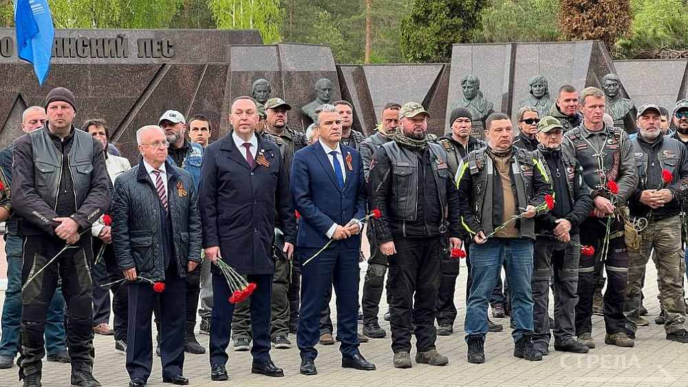 Здесь участники Всероссийского мотоклуба «Ночные волки» взяли частицу Вечного огня, возложили к мемориалу цветы, заложили капсулу с посланием для потомков и почтили память всех погибших в годы Великой Отечественной войны минутой молчания ,сообщает РИА «Стрела».