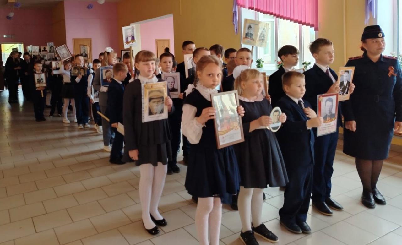 Затем все собравшиеся с портретами своих Героев в руках прошли по территории школы праздничной колонной в «Бессмертном полку», исполняя песню «Катюша». Такой трогательный момент не мог никого оставить равнодушными, многие участники не сдерживали слез.