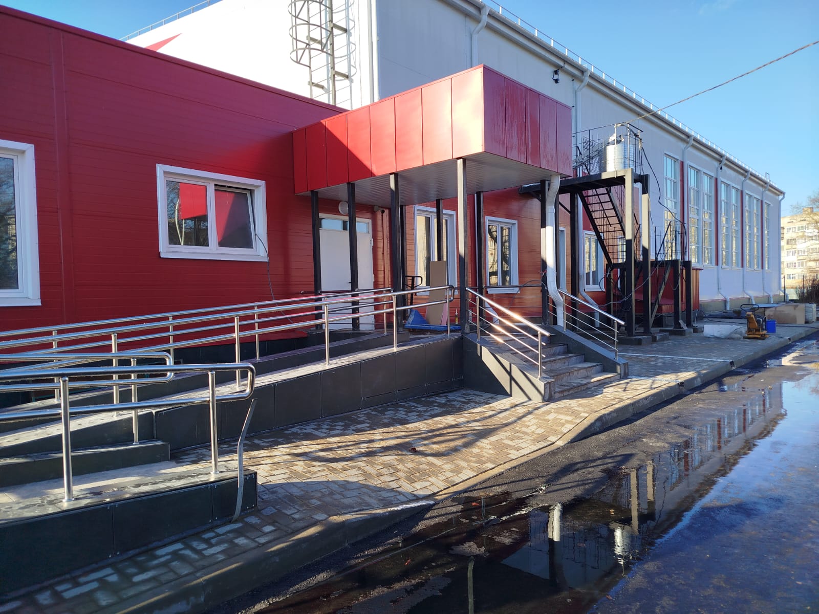 Благоустроена и прилегающая к зданию спортивного комплекса территория. Высажены декоративные кустарники, обустроены дорожки из тротуарной плитки, асфальтированы проезды, стоянка для транспорта.
