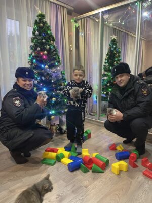Савелий и его старшая сестра получили от полицейских сладкие сувениры. Они предложили гостям поиграть с котятами, которые совсем еще крошечные, но тоже, не сдерживая любопытства, побежали к елке и играть с кубиками. Инспектор Екатерина Кускова пообщалась ребятами на тему безопасности на объектах железной дороги.